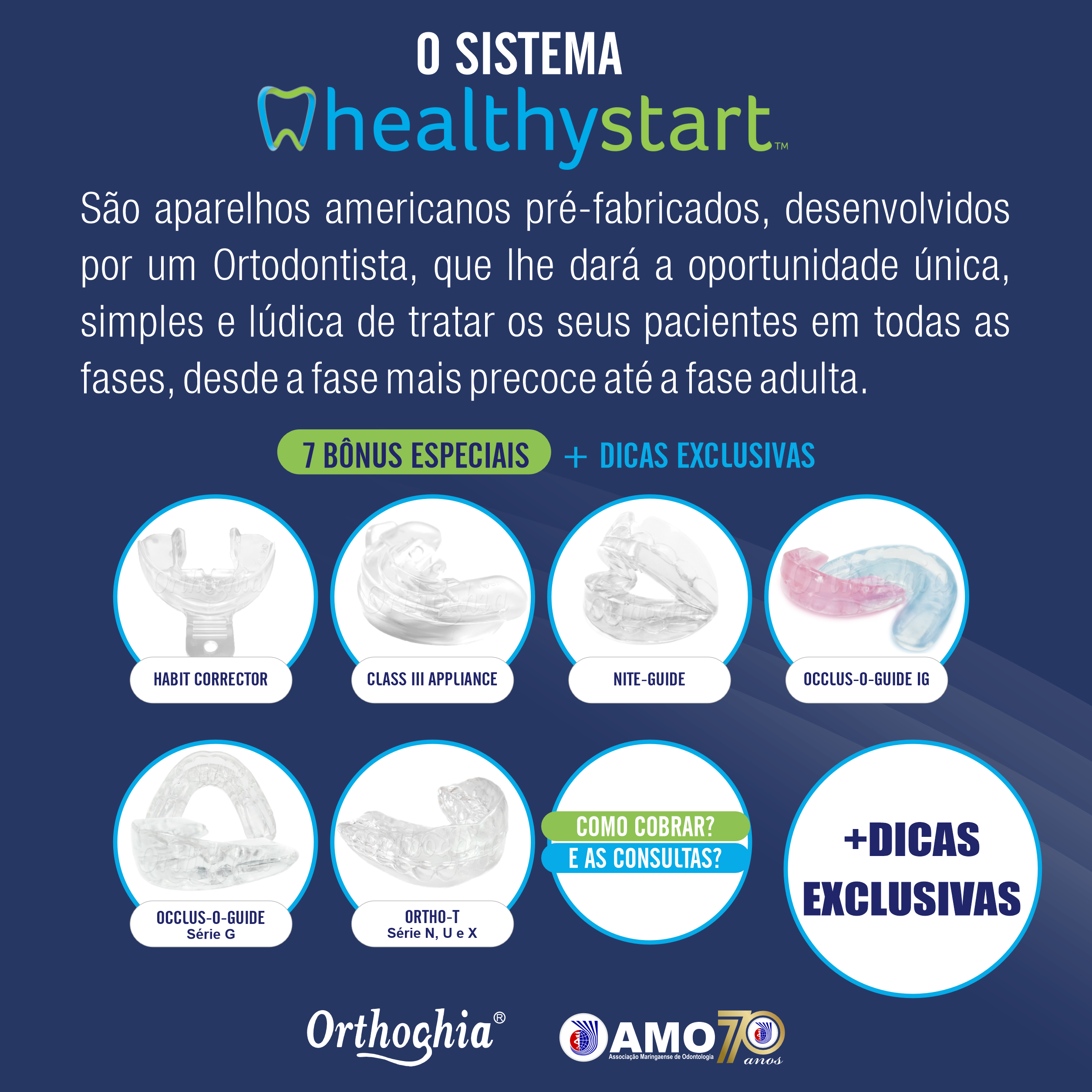 O Sistema HealthyStart™ consiste em aparelhos ortodônticos americanos pré-fabricados, desenvolvidos por um ortodontista, que oferecem uma oportunidade única, simples, lúdica e eficaz de tratar pacientes desde a infância até a vida adulta. Com foco em intervenção precoce, os dispositivos atuam em diferentes fases do desenvolvimento bucal, corrigindo hábitos, alinhando a arcada dentária e promovendo a saúde geral de forma não invasiva. É uma abordagem moderna que integra ciência e praticidade para proporcionar resultados duradouros desde as fases iniciais da vida.